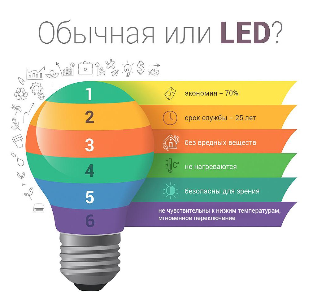 - Светодиодные источники света эффективнее: лампы накаливания - 17 лм / Вт, энергосберегающие лампы - 62,5 лм / Вт и светодиодные лампы - 100 лм / Вт. Эффективность заметна при оплате счетов за электроэнергию, так как светодиодная лампа будет потреблять меньше энергии за счет своей эффективности.
